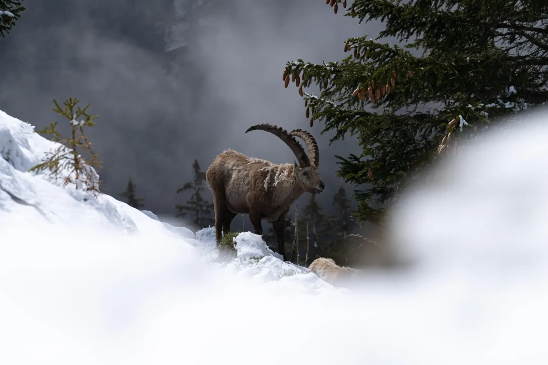 En contrebas, il avance entre les sapins et les premières neiges. La terre et la glace se mêlent encore, la lumière glisse sur son pelage épais. Tout semble calme, suspendu, comme un instant de répit avant l’hiver.