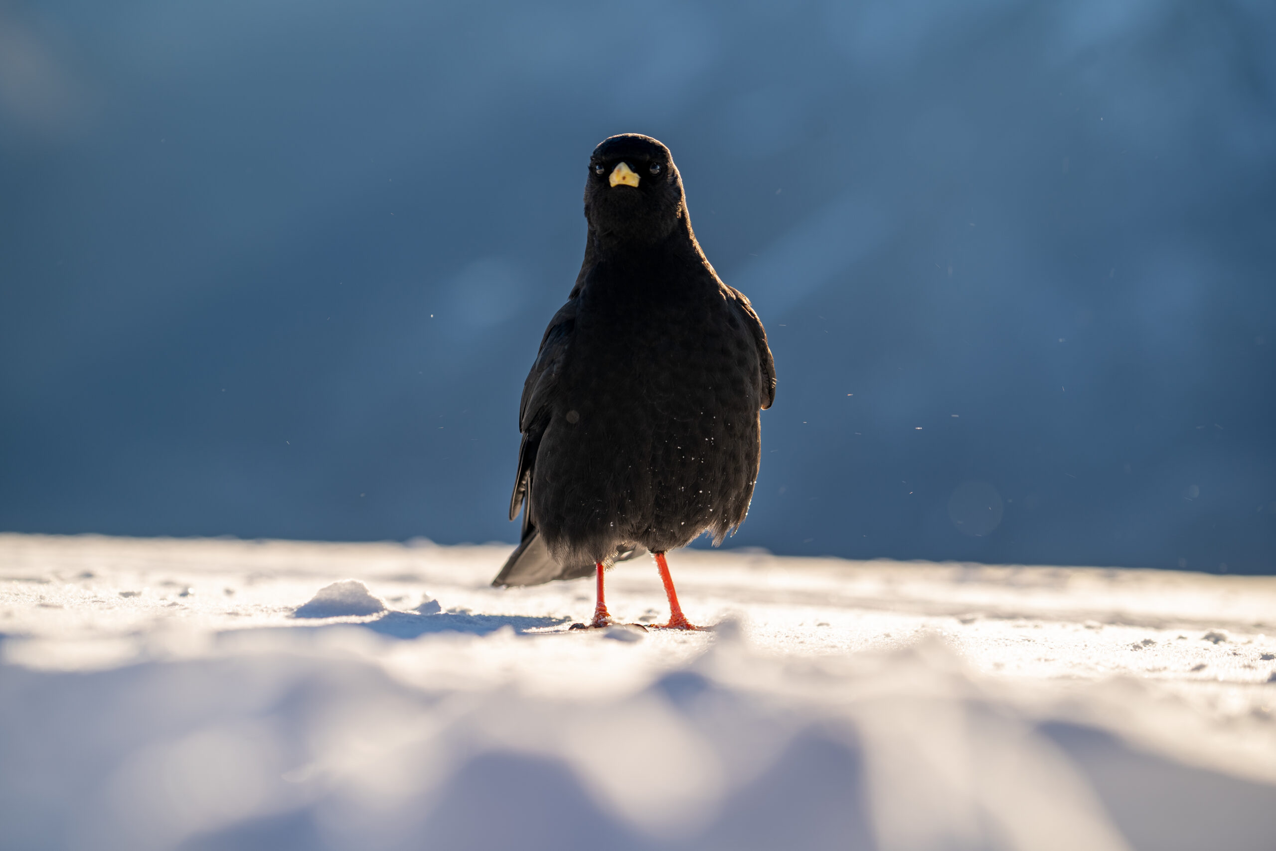 Sur la neige éclatante, il se tient droit, immobile. La lumière glisse sur son plumage sombre, souligne sa présence. Fier et calme, il fait face, comme s’il mesurait l’intrus venu troubler son royaume d’altitude.