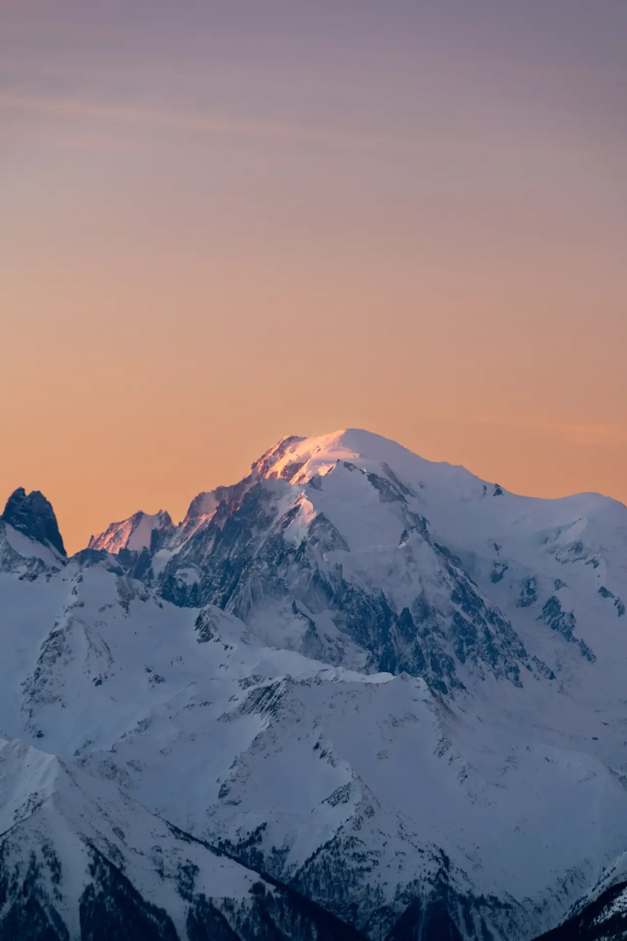Les premières lueurs effleurent timidement l’horizon, et déjà le ciel s’embrase d’un orange doux, presque irréel. Lentement, la lumière glisse sur les glaciers, réveillant les arêtes figées par la nuit. Le Mont Blanc s’éveille dans un silence solennel, drapé de feu et de givre. À cet instant suspendu, la montagne ne domine plus, elle rayonne.