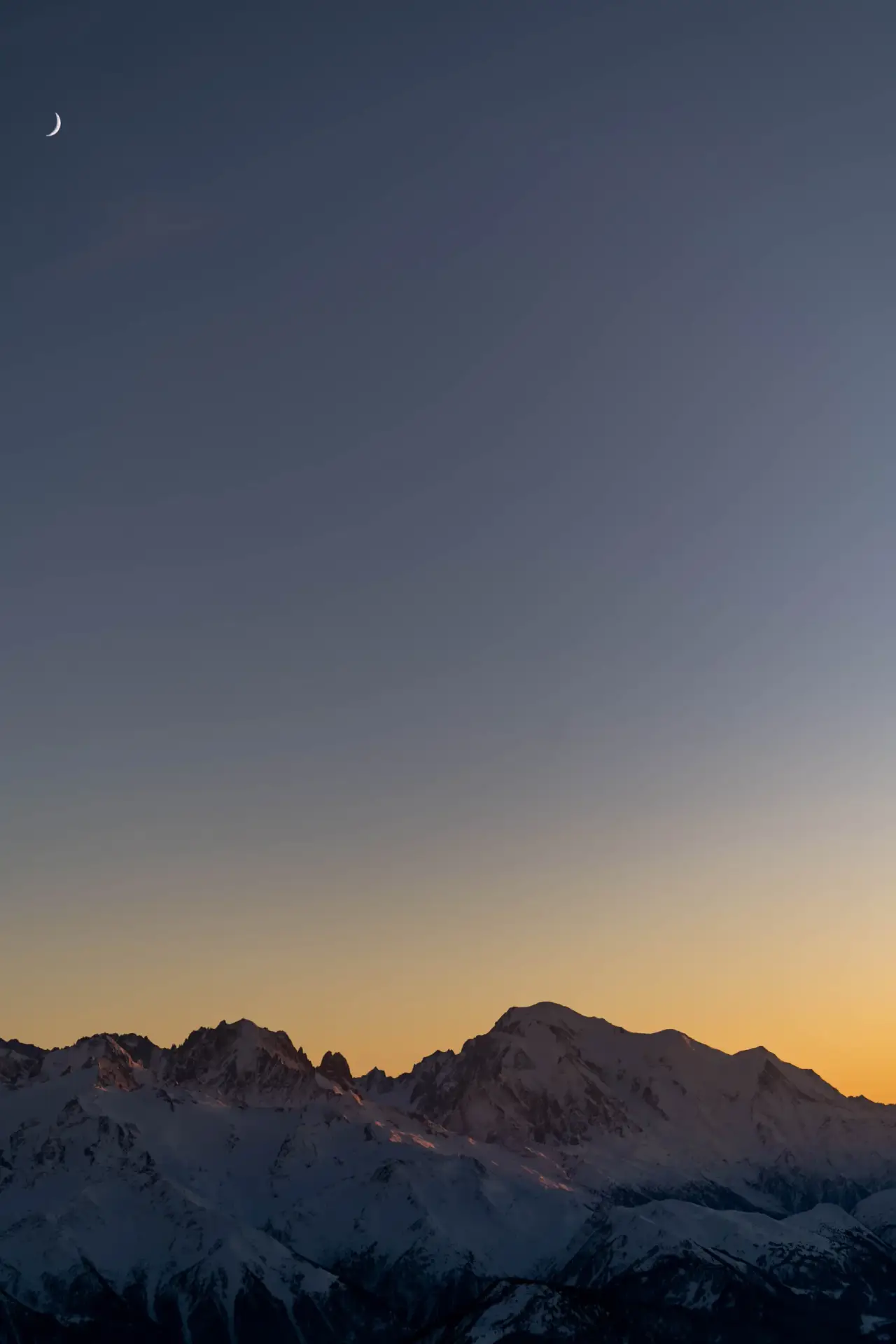 À l’heure où le soleil s’éteint derrière l’horizon, le massif du Mont Blanc s’habille de nuances délicates. Sous le regard discret d’un croissant de lune, les cimes enneigées s’assoupissent lentement, bercées par la lumière mourante. Dans ce silence suspendu, la montagne semble rêver, entre la nuit naissante et les souvenirs dorés du jour.