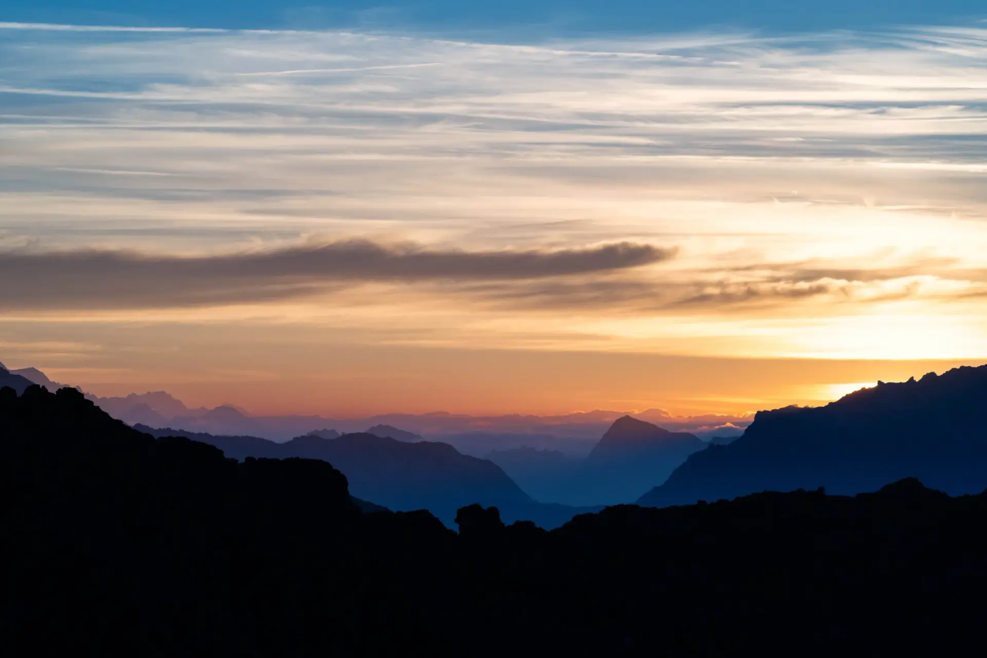 Les montagnes s’empilent comme des souvenirs, ciselées par la lumière. L’aurore les dévoile une à une, en couches de silence et de feu, jusqu’à ce que le jour prenne toute la place dans le ciel.